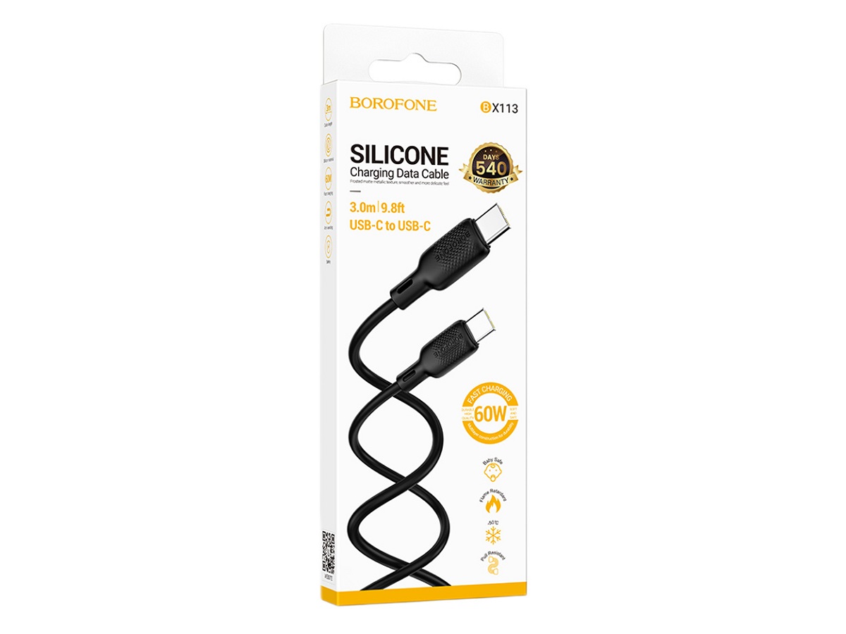 Кабель Type-C — Type-C Borofone BX113 Lenny, 3.0м, 3.0A, PD60Вт, силикон, цвет: чёрный (1/360)