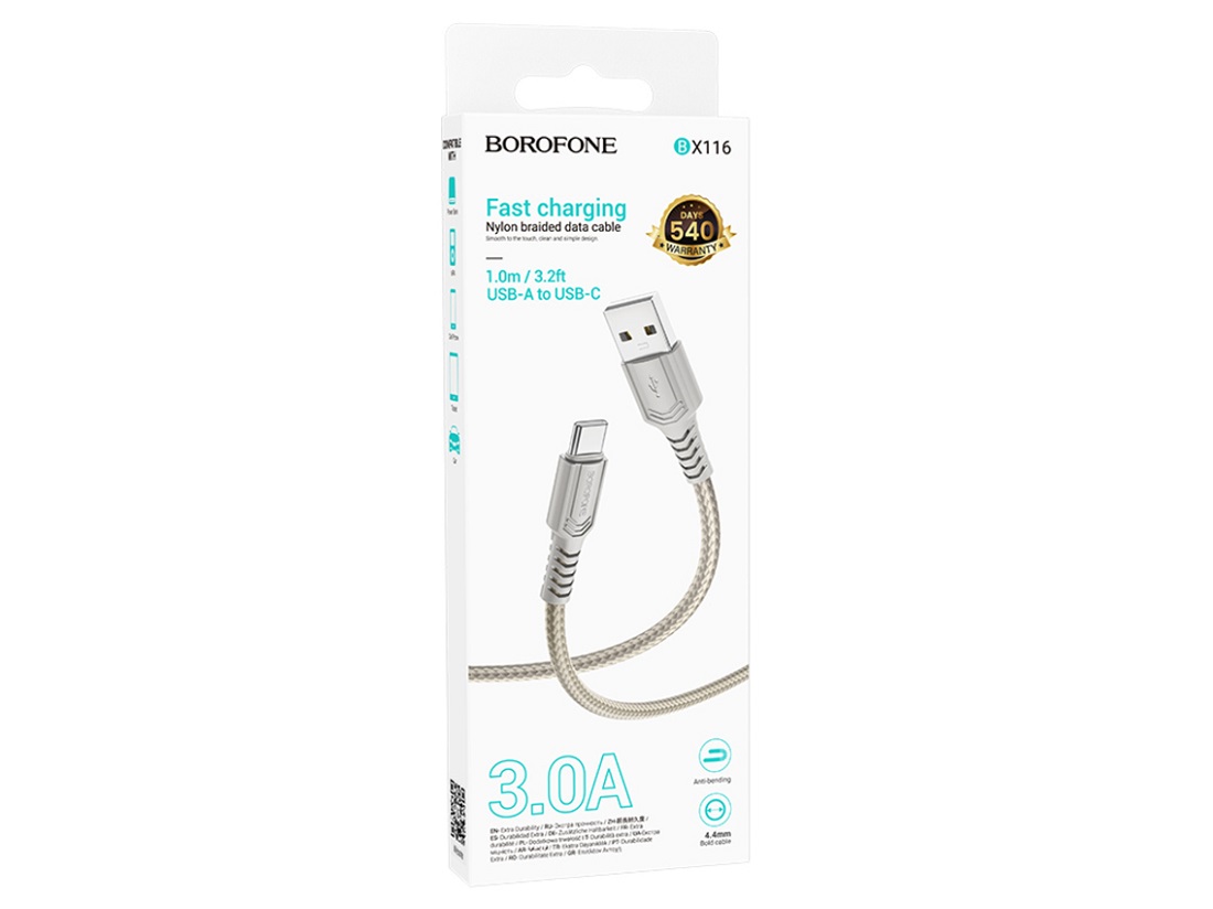 Кабель USB — Type-C Borofone BX116 Certain, 1.0м, 3A, ткань, цвет: серый (1/360)