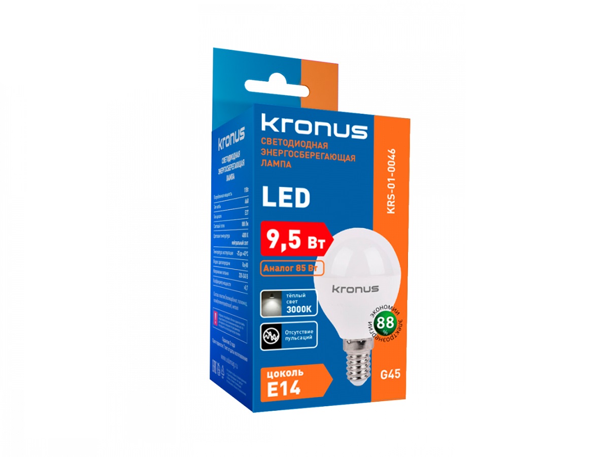 Лампа светодиодная KRONUS G45 шар 9,5 Вт 220V 3000K E27 тёплый свет (10/100)