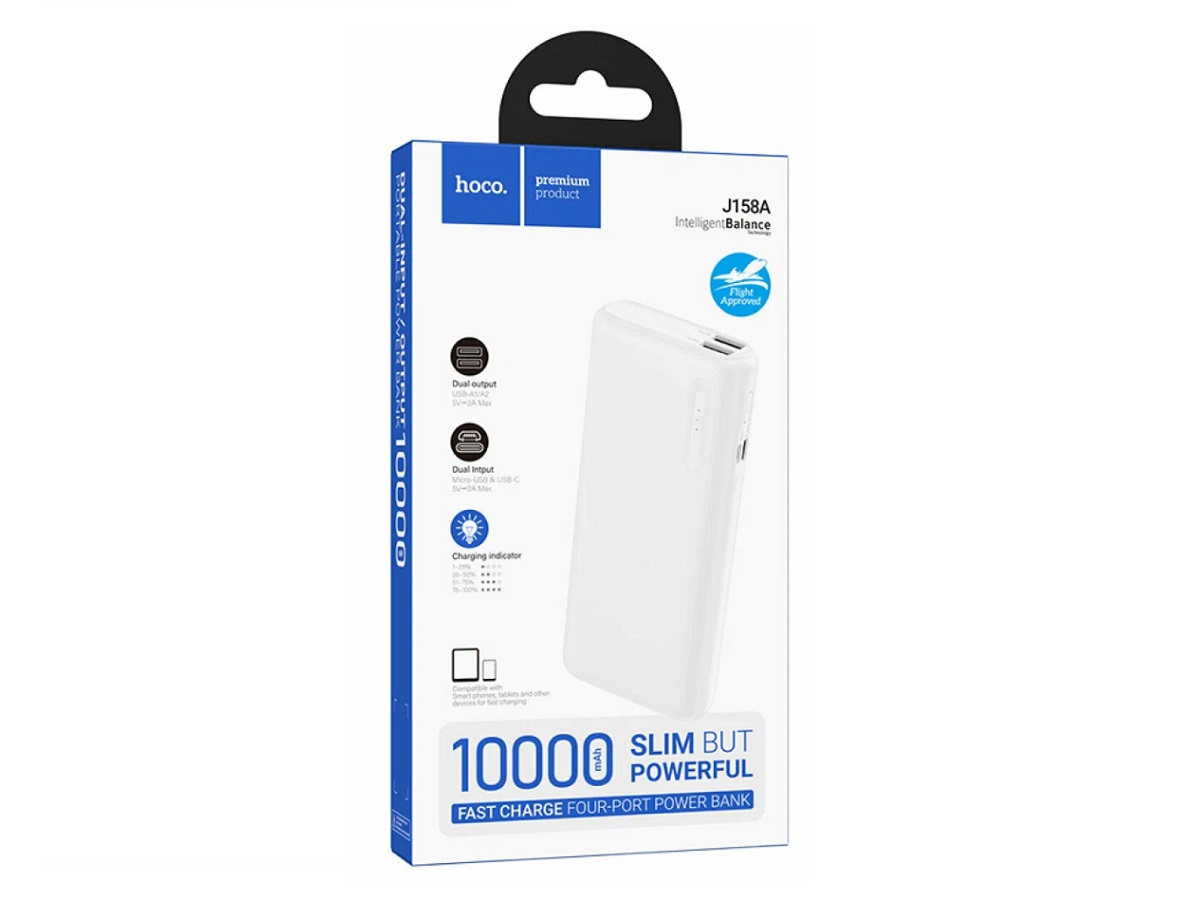 Акк.внешн. HOCO J158A Runner, 10000mAh, пластик, индикатор, 2 USB, цвет: белый (1/46)