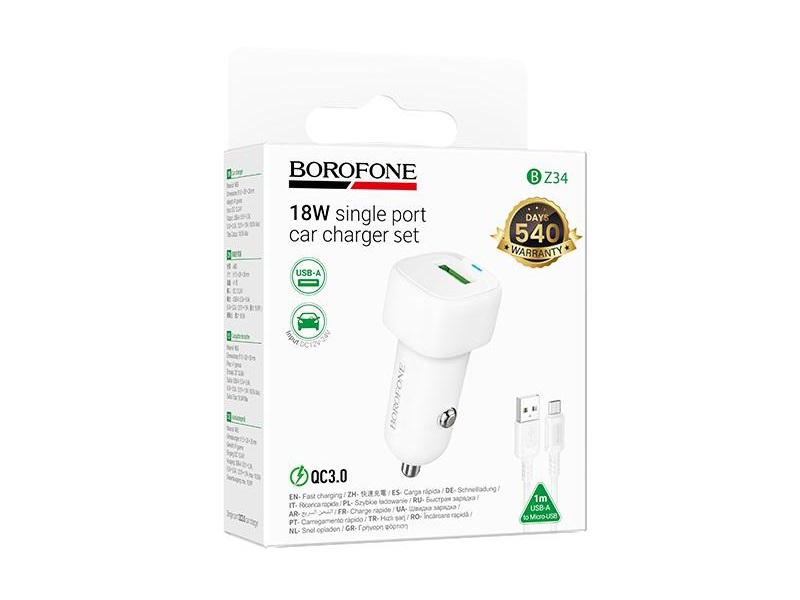 АЗУ 1 USB Borofone BZ34 Cloud, PD18Вт, QC3.0, кабель USB — микро USB, цвет: белый (1/94/376)