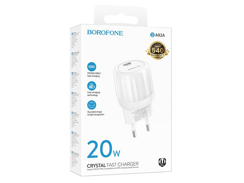 Блок питания сетевой 1 Type-C Borofone BA92A Lustrous, пластик, PD20Вт, QC3.0, белый (1/30/120)