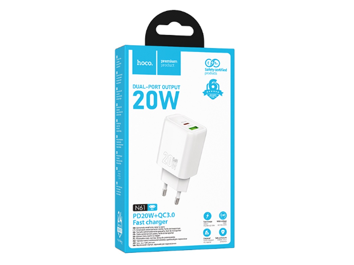 Блок питания сетевой 1 USB, 1 Type-C HOCO N61 Gentle, 3.0A, PD20Вт, цвет: белый (1/12/120)