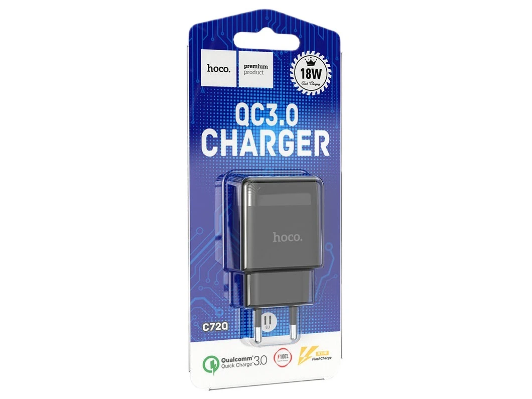 Блок питания сетевой 1 USB HOCO C72Q, Glorious, 3A, пластик, QC3.0, цвет: чёрный