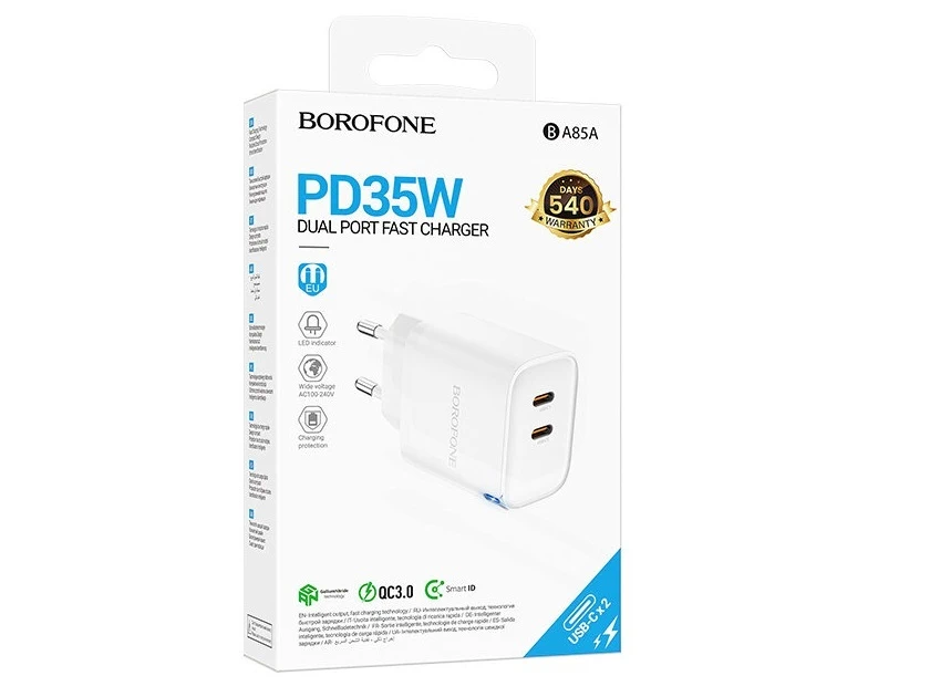 Блок питания сетевой 2 Type-C Borofone BA85A Flare, пластик, PD35Вт, QC3.0, цвет: белый (1/40/160)