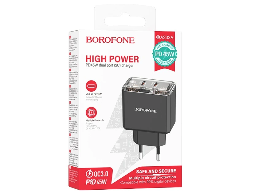 Получите консультацию по товару Блок питания сетевой 2 Type-C Borofone BAS33A Treasure, пластик, PD45Вт, цвет: чёрный (1/36/144) от наших опытных менеджеров.