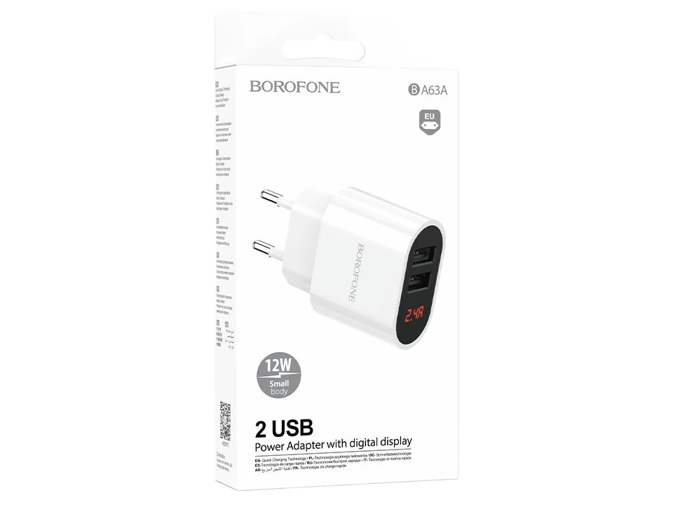 Блок питания сетевой 2 USB Borofone BA63A, Richy, 2400mA, пластик, дисплей, цвет: белый (1/210)