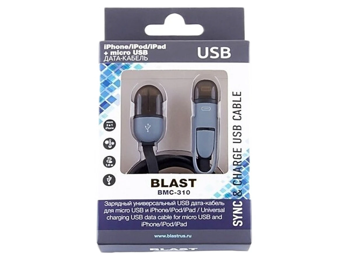 Кабель BLAST BMC-310, USB 2.0 — 8 pin Lightning, micro USB, черный, плоский, комбинированный, 1 м.