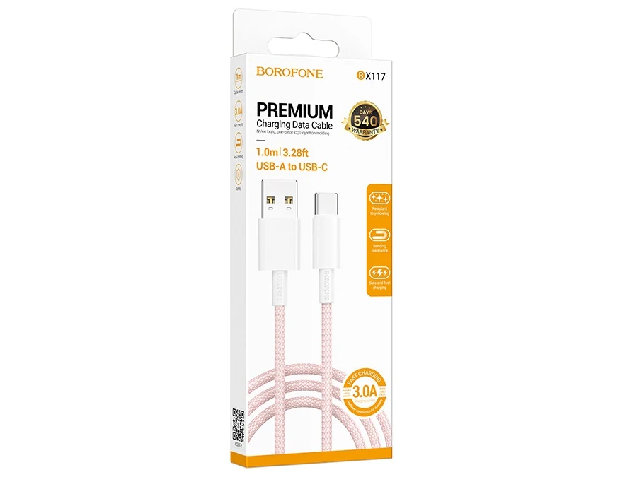 Кабель USB — Type-C Borofone BX117 Source, 1.0м, 3A, ткань, цвет: розовый (1/360)