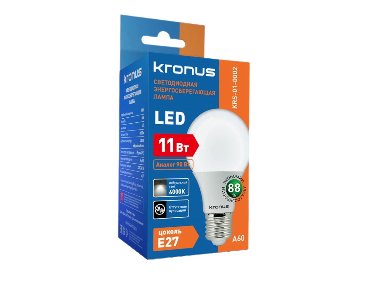 Лампа светодиодная KRONUS A60 груша 11 Вт 220V 4000K E27 нейтральный свет (10/100)