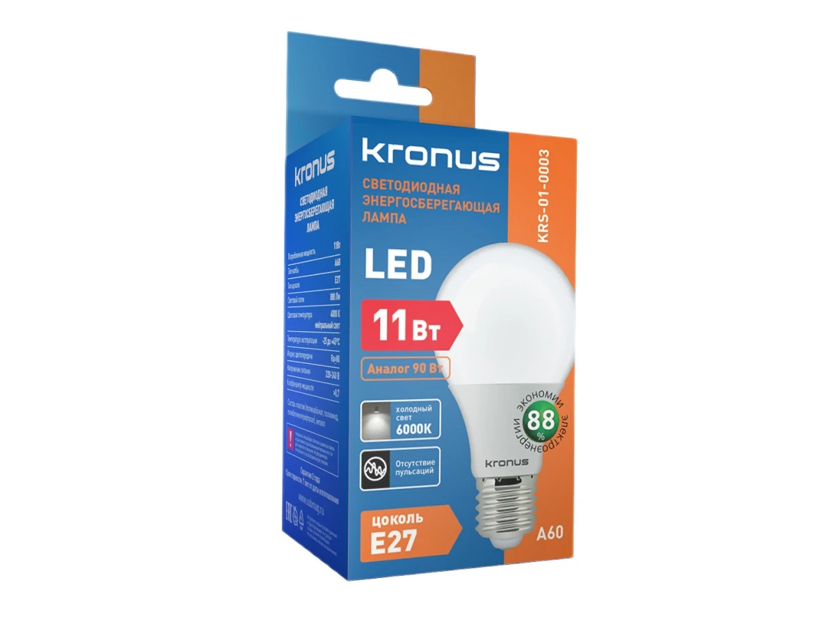 Лампа светодиодная KRONUS A60 груша 11 Вт 220V 6000K E27 холодный свет (10/100)