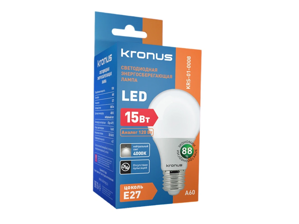Лампа светодиодная KRONUS A60 груша 15 Вт 220V 4000K E27 нейтральный свет (10/100)