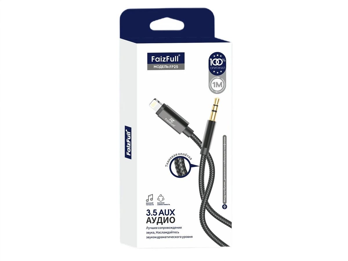 Шнур — Переходник Lightning (папа) —-> AUX 3,5мм. (папа) FaizFull FP25 1м. /20/500