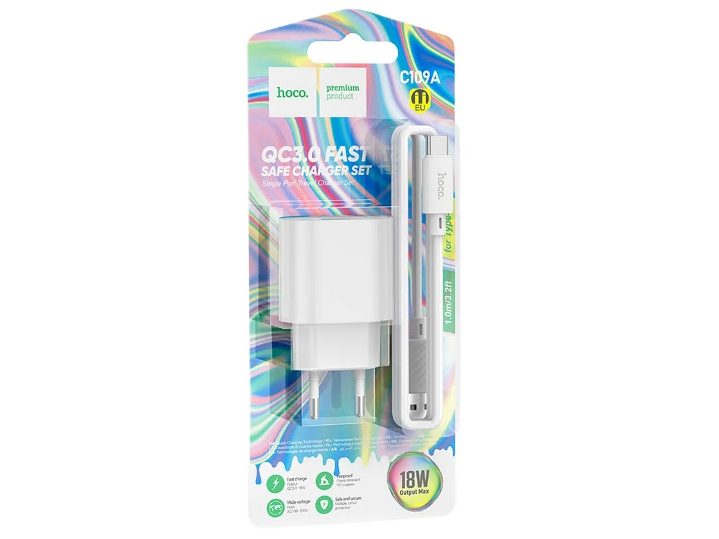 СЗУ 1 USB HOCO C109A Fighter, QC3.0, кабель Type-C, цвет: белый (1/27/162)
