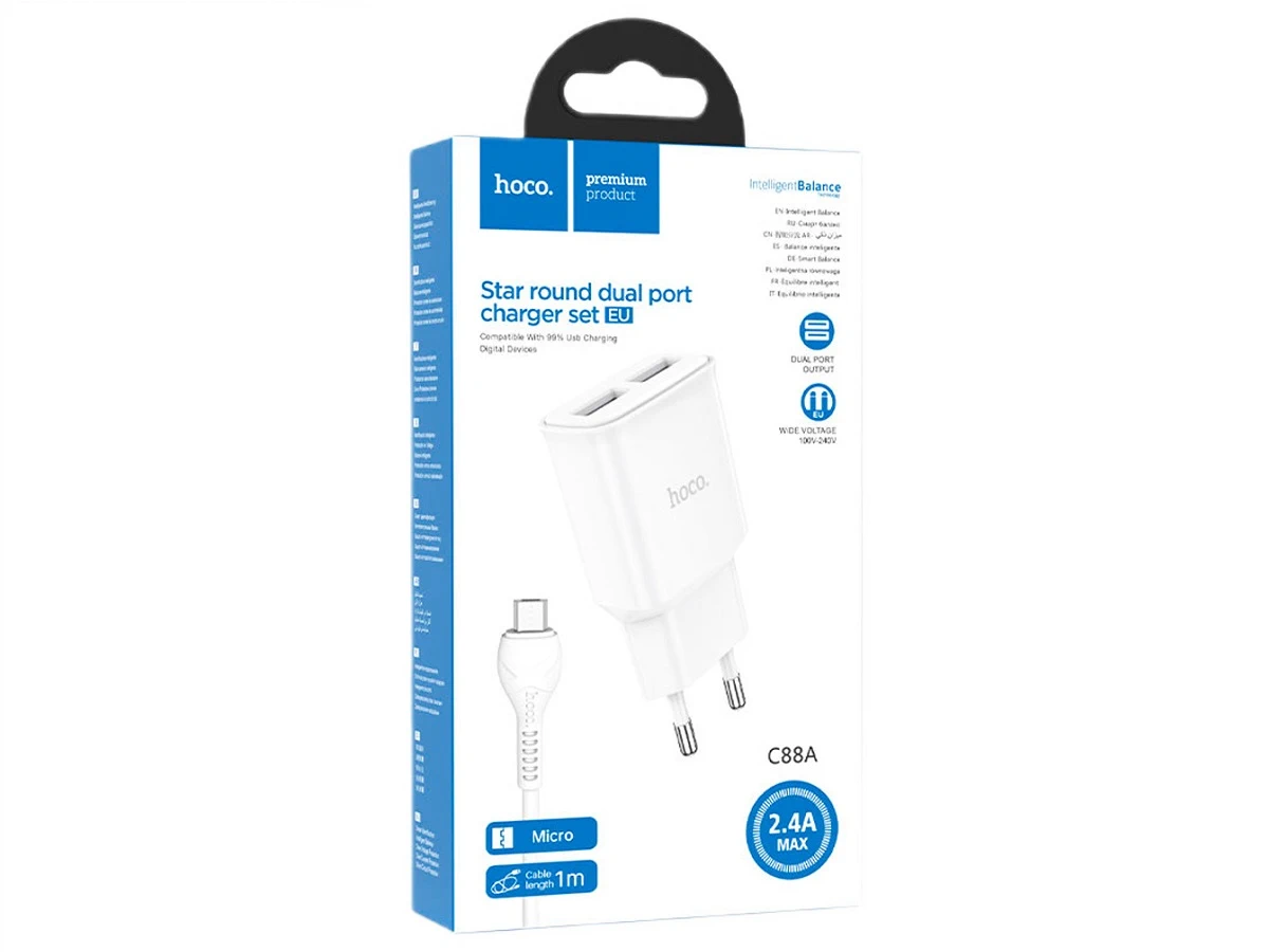 СЗУ 2 USB HOCO C88A Star, 2400mA, пластик, кабель микро USB, 1.0м, цвет: белый (1/12/120)