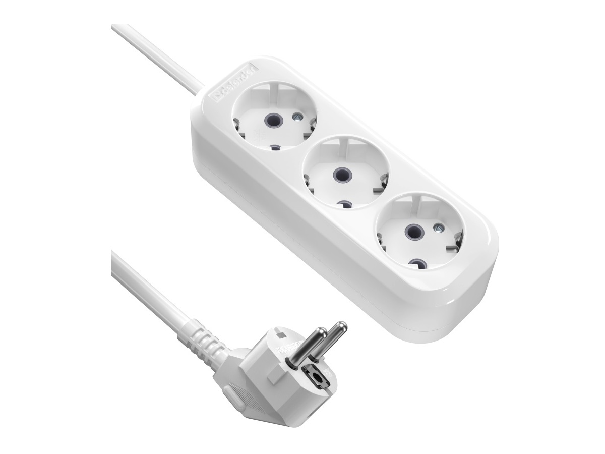 Удлинитель DEFENDER R330 3 гнезда, 2 метра, 16А/3500Вт, с заземлением, ПВС 3х1,0мм, белый (1/40)